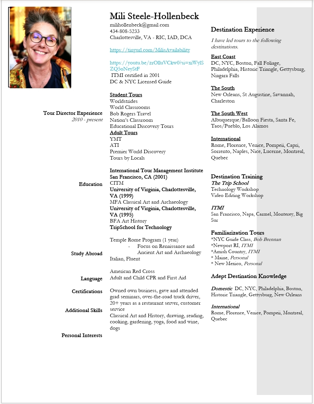 After graduating from UVA, I attended ITMI in 2001. After the downturn caused by 9/11 I returned to the industry and have been leading tours full-time for 7 years. I specialize in the Eastern Seaboard from Quebec to Florida. I led some tours in Italy when I first started, but think I am ready to go back!